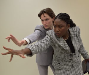 Duo Interpretation: Two students provide a roughly 8-10 minute interpretation of a piece of drama. The script is generally memorized, but a manuscript is employed. Community conventions govern acceptable forms of movement, contact of the performers and so forth.
