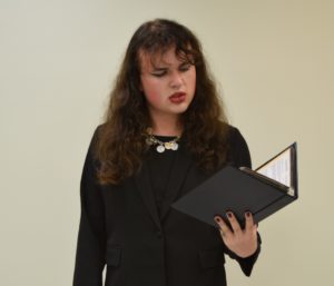 Dramatic Interpretation: A single student interprets a piece of dramatic literature cut to roughly 8-10 minutes in length. The literature may be a monologue or contain multiple voices, so long as it was authored with the purpose of dramatic performance. The script is generally memorized, but a manuscript is employed.